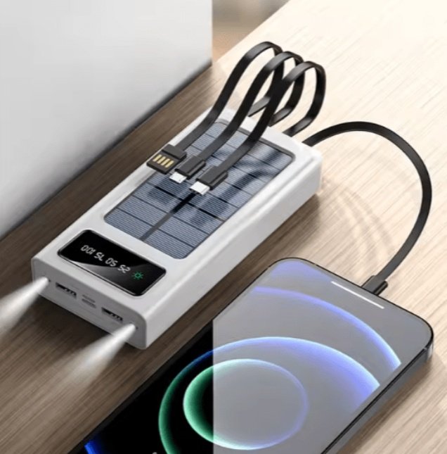 Stay powered anywhere with the 30000mAh Solar Power Bank , your ultimate portable charging solution. Designed for outdoor enthusiasts and daily commuters alike, it features high-capacity power storage, solar recharging, multiple built-in cables, and a smart LED display. Whether you’re camping, traveling, or just on the go, this solar charger keeps all your devices fully charged.